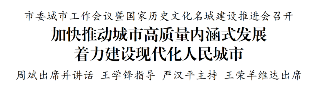 12月19日,市委城市工作会议暨国家历史文化名城建设推进会召开。市委书记周斌出席并讲话。他强调,要深入学习贯彻习近平总书记关于城市工作的重要论述和中央城市工作会议精神,认真落实省委部署要求,加快推动城市高质量、内涵式发展,着力建设创新、宜居、美丽、韧性、文明、智慧的现代化人民城市。省住建厅厅长王学锋到会指导。市委副书记、市长严汉平主持,市人大常委会主任王荣、市政协主席羊维达出席。