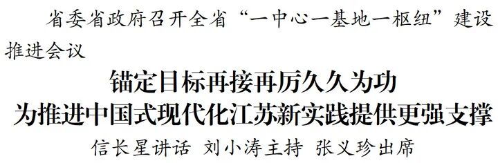 2月24日,省委、省政府召开全省“一中心一基地一枢纽”建设推进会议,深入学习贯彻习近平总书记对江苏工作重要讲话精神,把握“十五五”发展面临的新形势、新任务,持续推进建设具有全球影响力的产业科技创新中心、具有国际竞争力的先进制造业基地、具有世界聚合力的双向开放枢纽,为打造发展新质生产力的重要阵地、推进中国式现代化江苏新实践提供更强支撑。省委书记信长星出席会议并讲话,省长刘小涛主持会议,省政协主席张义珍出席会议。