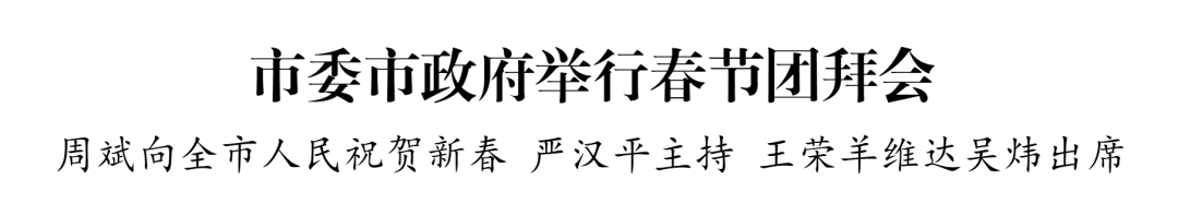 岁序常易,华章日新。2月14日,市委、市政府举行2026年春节团拜会。市委书记周斌、市长严汉平、市人大常委会主任王荣、市政协主席羊维达、市委副书记吴炜等市领导,与各界人士欢聚一堂、共迎新春,向全市人民和所有参与、关心、支持盐城发展的海内外朋友,致以新春问候和美好祝福,共同祝愿伟大祖国繁荣昌盛、国泰民安,祝愿盐城欣欣向荣、蒸蒸日上,祝愿全市人民平安吉祥、马到成功。