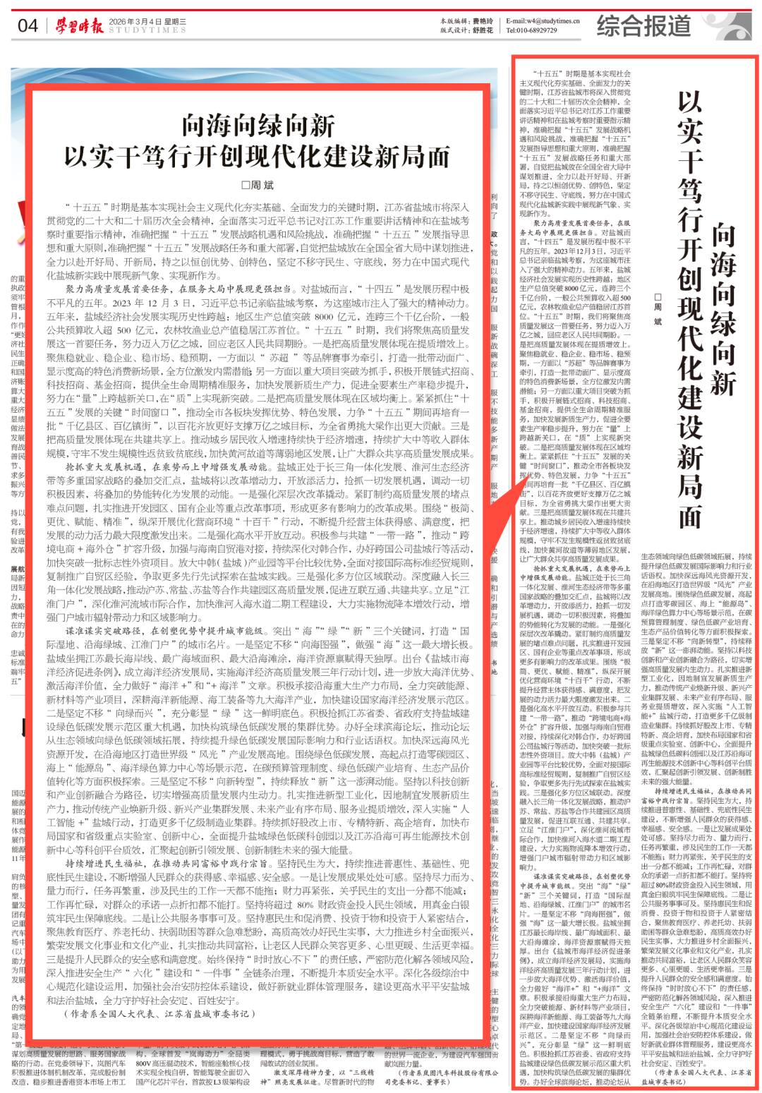 二是坚定不移“向绿而兴”,充分彰显“绿”这一鲜明底色。积极抢抓江苏省委、省政府支持盐城建设绿色低碳发展示范区重大机遇,加快构筑绿色低碳发展的集群优势。办好全球滨海论坛,推动论坛从生态领域向绿色低碳领域拓展,持续提升绿色低碳发展国际影响力和行业话语权。加快深远海风光资源开发,在沿海地区打造世界级“风光”产业发展高地。围绕绿色低碳发展,高起点打造零碳园区、海上“能源岛”、海洋绿色算力中心等场景示范,在碳预算管理制度、绿色低碳产业培育、生态产品价值转化等方面积极探索。
