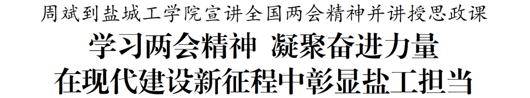 3月17日,市委书记周斌到盐城工学院宣讲全国两会精神并讲授思政课,与青年学子交流学习心得体会,希望大家自觉把思想和行动统一到习近平总书记重要讲话精神和全国两会精神上来,坚定发展信心,凝聚奋进力量,努力创造“十五五”更好实绩,在盐城现代化建设新征程中彰显盐工担当。