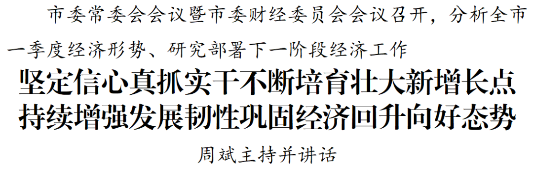 4月20日,市委常委会会议暨市委财经委员会会议召开,深入学习习近平总书记重要讲话重要指示精神,传达学习省委常委会会议部署要求,分析全市一季度经济形势、部署下一阶段经济工作。市委书记、市委财经委员会主任周斌主持并讲话。